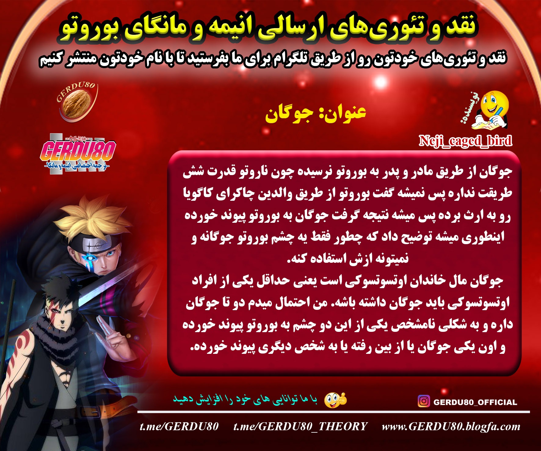 🔹همونطور که در انیمه ناروتو دیدید چشم ناروتو با چاکرای کیوبی تغییر پیدا میکرد ولی در اصل این یه تکنیک چشمی نبود و یه نمونه دیگه هنگام استفاده از حالت سنجوتسو بود که دوباره چشم تغییر پیدا میکرد ولی تکنیک چشمی نبود پس میتونیم حدس بزنیم که جوگان مانند دو نمونه که مثال زدم است یعنی جوگان دوجوتسو نیست و قدرت دیگری است که وقتی بوروتو از اون استفاده میکنه چشمش تغییر پیدا میکنه ولی احتمالش کمه.